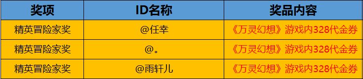 1、精英冒险家奖*3人——《万灵幻想》游戏内328代金券