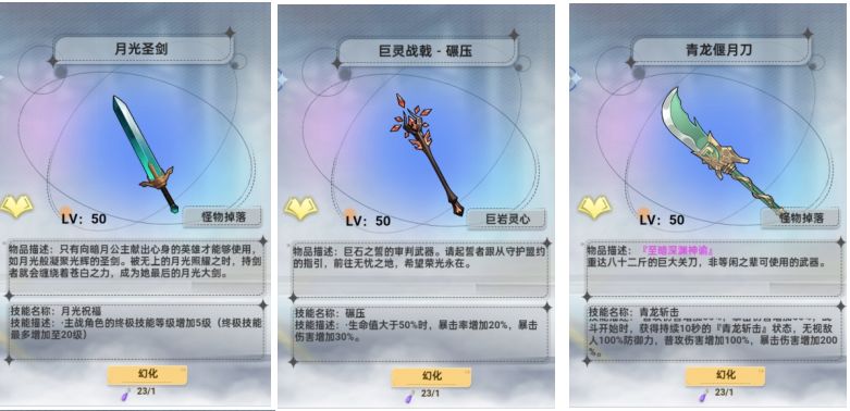 武器选择以上装备,黄金圣剑是主线关卡装备,可放魔王位,巨灵战戟-碾压是打造装备,最终是选择独特神谕-螺旋长枪。属性雷属性最好,没有亦可。其他选择就是活动的50%暴击武器。