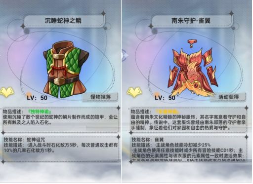 衣服较随意了,普通装备输出较少,最少锁定蛇衣。这里放了个活动装,南朱守护-雀翼极度适配无畏剑术,配合希尔1秒1次。