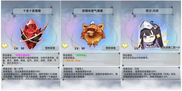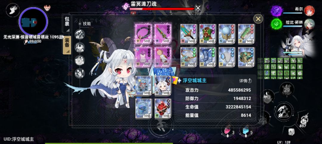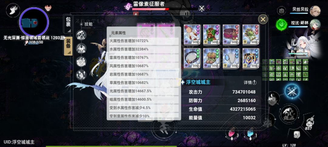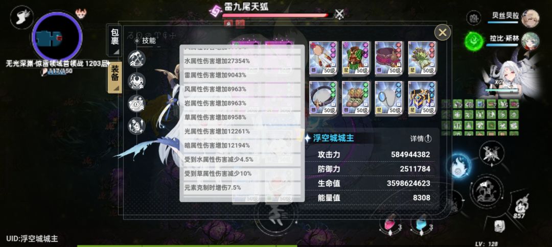 以上是1203雷,提供给没有牛衣,贝丝雕像的人。零+拉比+贝丝贝拉。装备需古皇兵装+无上福音(用来能量转光属性,必须),词条能量12+暴击6+生命值或水属性。因为有光与暗之书,所以放了两个图,一个复活2次,一个复活4次。复活4次的六属性值和复活2次的光属性差1600左右,如果拿个复活,5次复活应该能超过。所以没有光与暗之书影响不大。这里装备加了千层以上出的破碎深渊神谕-月之棘刺护手鞋子和月光女神项链。1300+能打动,伤害打不死了,需要氪金宠支撑了。英勇盾击+牛衣,可以上1400,但有贝丝+牛衣也不需要零了。