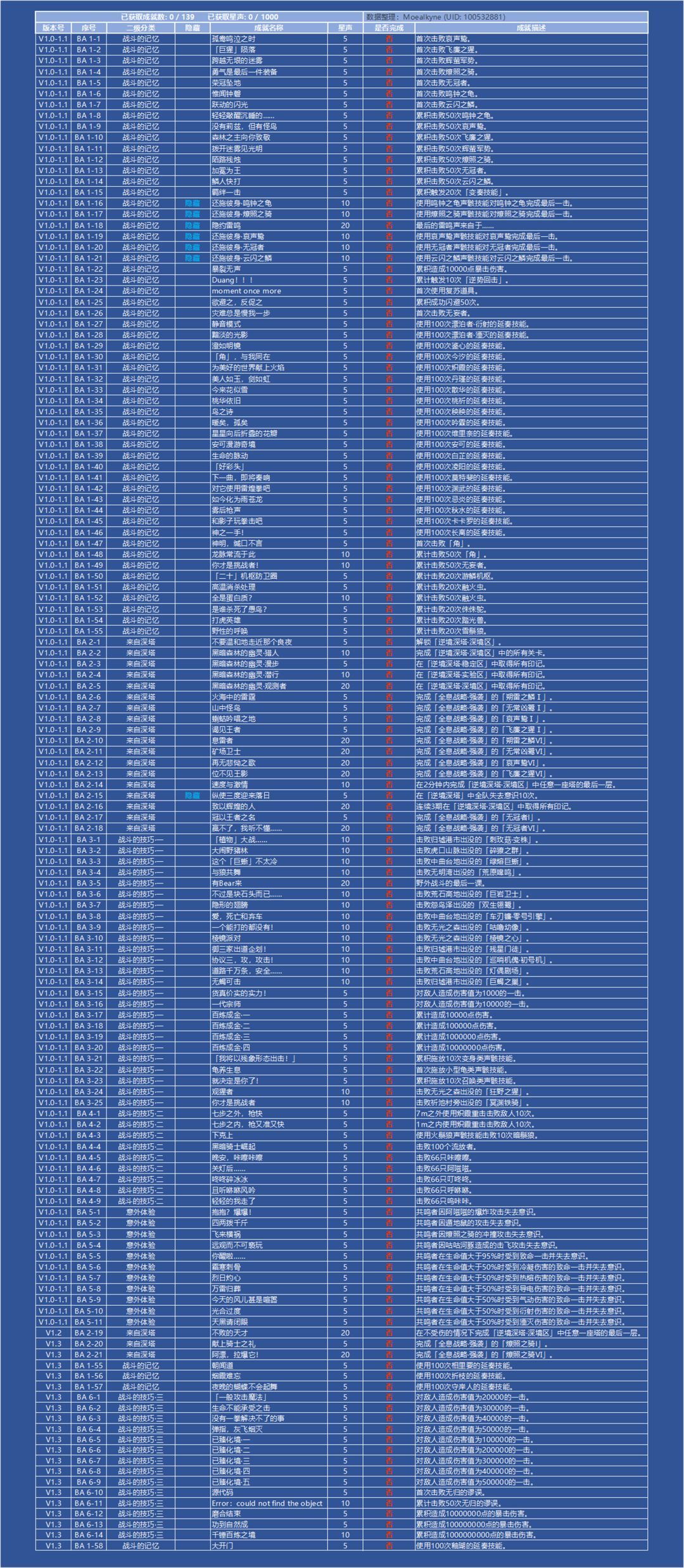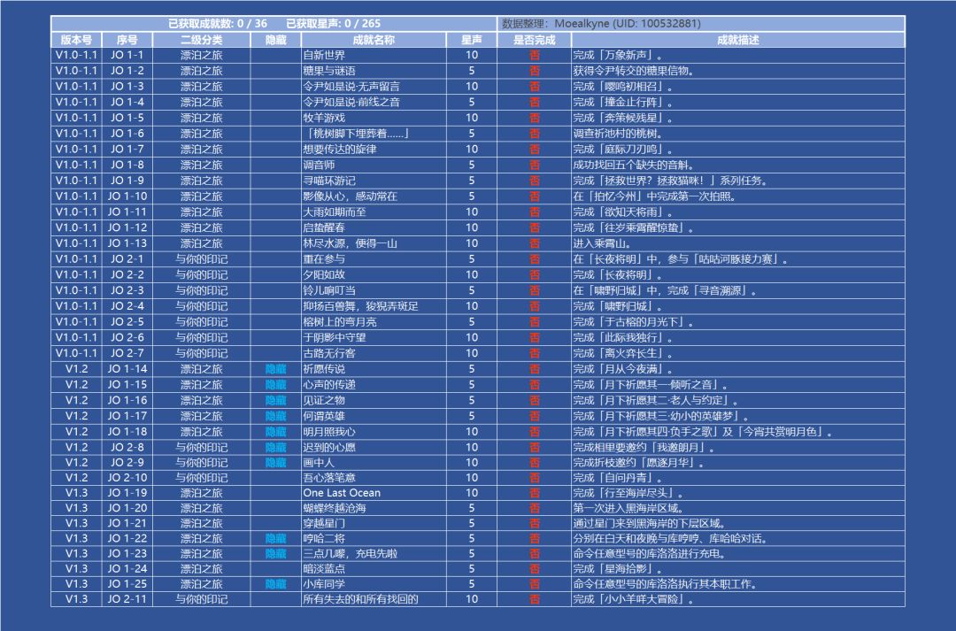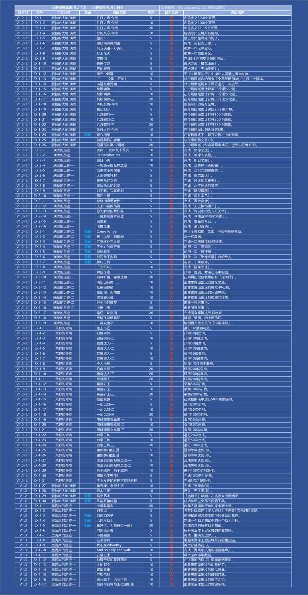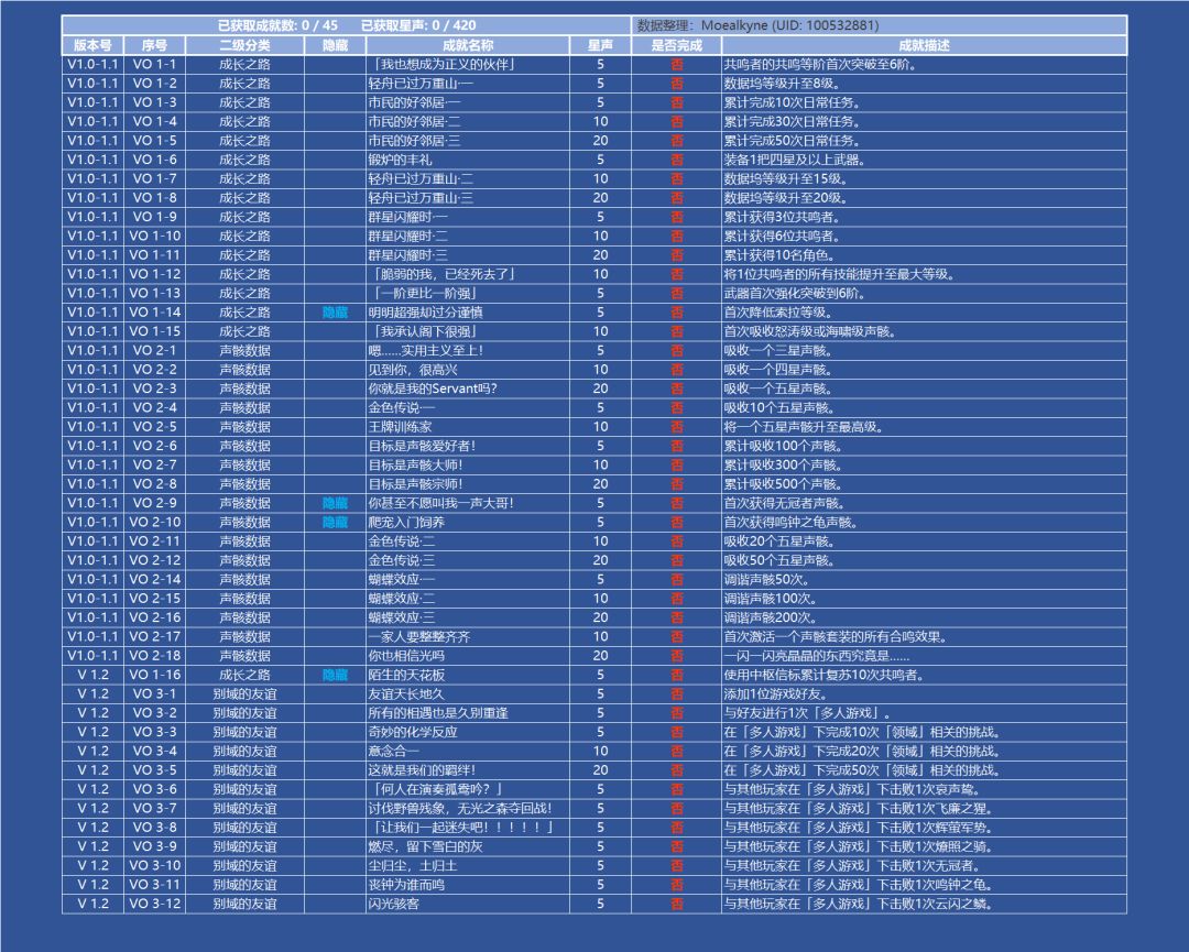 通过此数据表,可以更快的查询自己未完成的成就,并及时记录!可以多多使用哦~