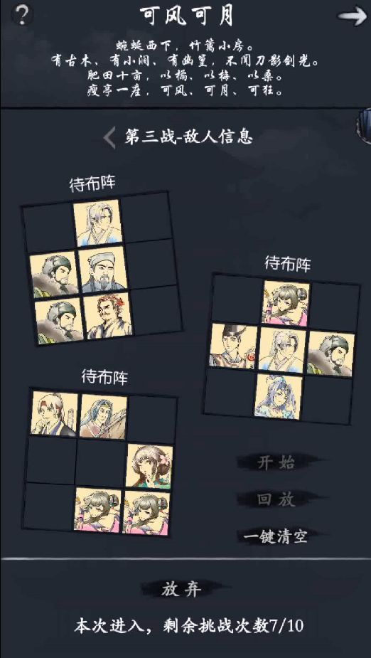 第二阵,没什么特别的难点,正常狼灵加何武学快速清场,小虎保一下后排两位C即可。