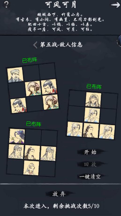 三阵:任楚楚+虎小山+范渊x2+陆采薇拿无羁扛一下,正常3刀阵容输出,上个林可以清一下后排
