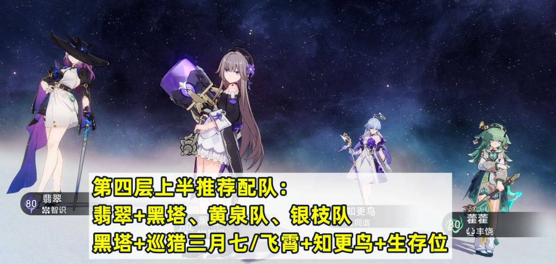 第四层上半可以选择:翡翠+黑塔+知更鸟+生存位、黄泉+椒丘+佩拉+加拉赫/其他生存位,这两个配队打到3W分甚至满分应该说比较轻松。还有虚构通解的银枝队,正好配合第三个队伍buff,可以无视敌方弱点削韧。