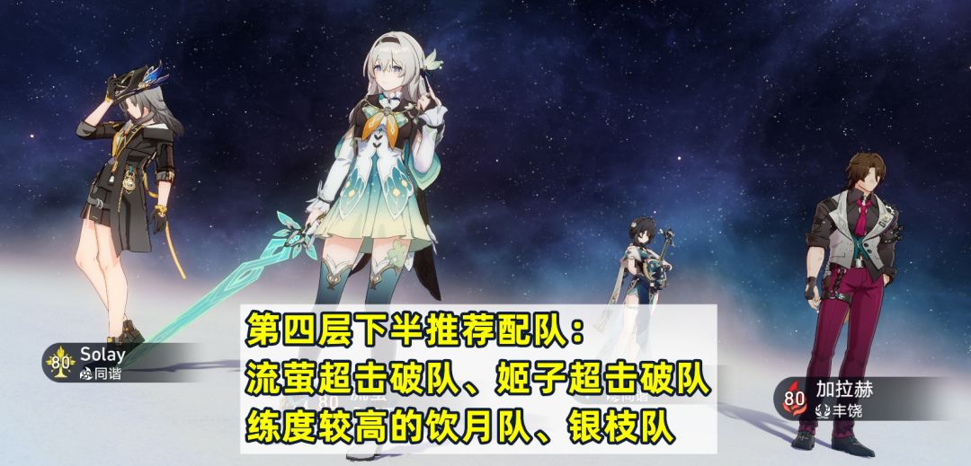 第四层下半同样可以选择银枝队,不过个人更推荐流萤超击破队或者姬子超击破队,练度较高的饮月队(饮月+花火+停云+加拉赫)也是可以用的~