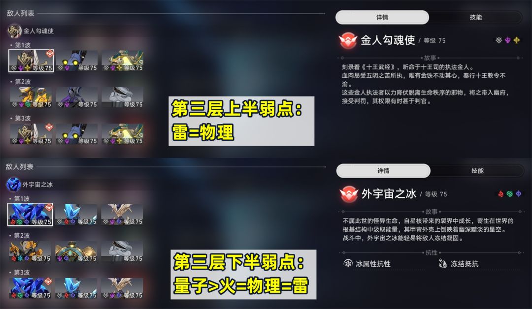 先来看第三层:上半是金人勾魂使、王下一桶、气泡犬和灯龙鱼的组合,主要弱点是物理和雷;加上气泡犬和灯龙鱼被击败后,还能给敌方挂debuff,所以很适合黄泉队。下半是外宇宙之冰、永灾冬影和虚数织叶者等,主要弱点是量子,其次是火、物理和雷。