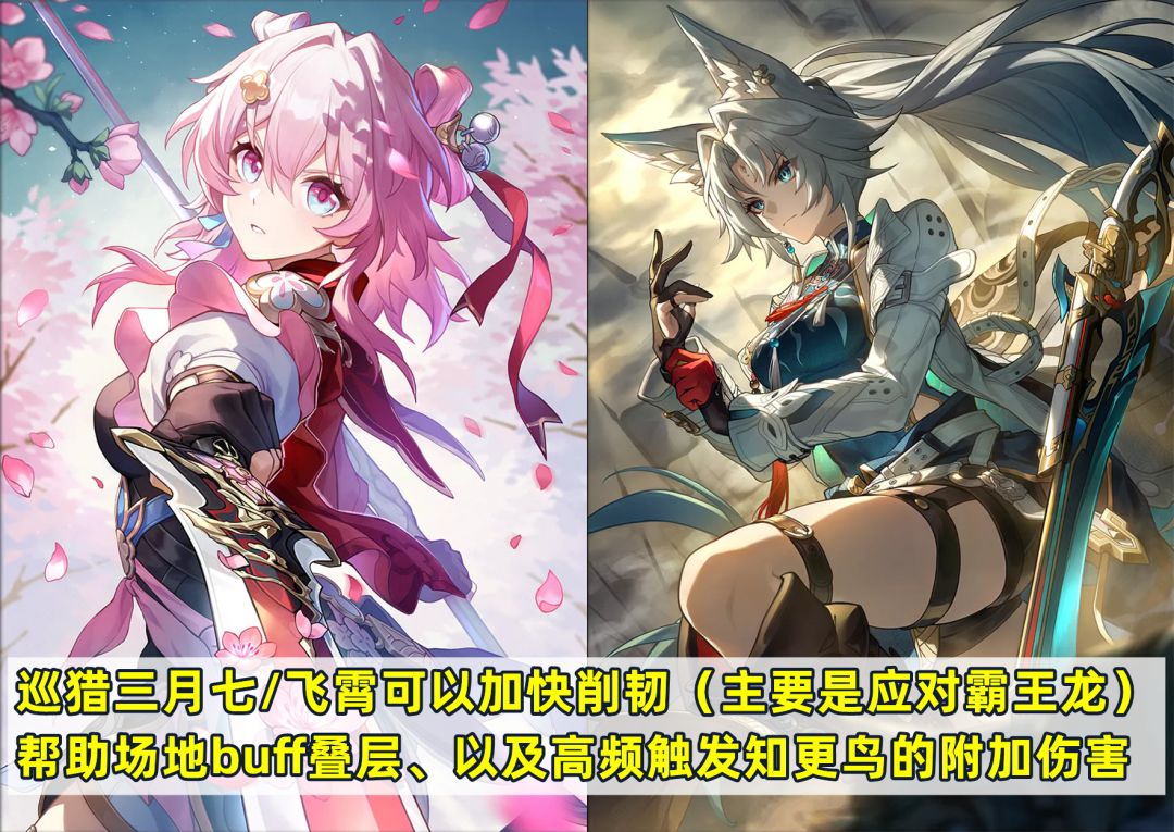 另外追击队还有一个很好用的配队思路:黑塔+巡猎三月七/飞霄+知更鸟+生存位,三月七和飞霄主要就是用于高频追击来触发场地buff、快速削韧以及知更鸟的附加伤害。