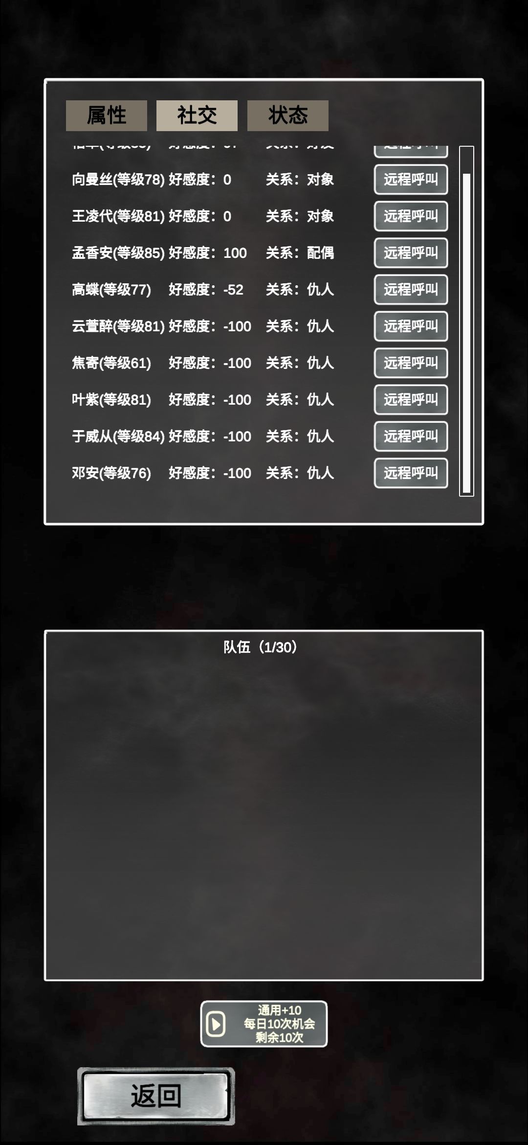 5:好感满100的异性点击表白和求婚,这里记住只能有一个配偶,建议最后一个弄,每成功一个对象,其他对象的好感度会减50或100,一定要把其他对象好感拉满,否则变成仇人就白弄了,最后祝大家玩得开心!