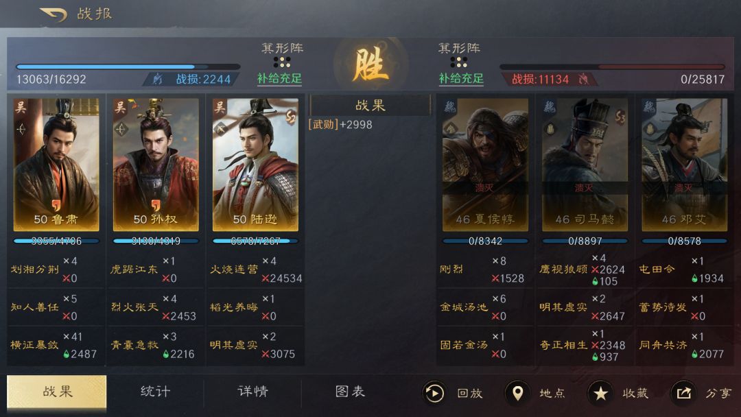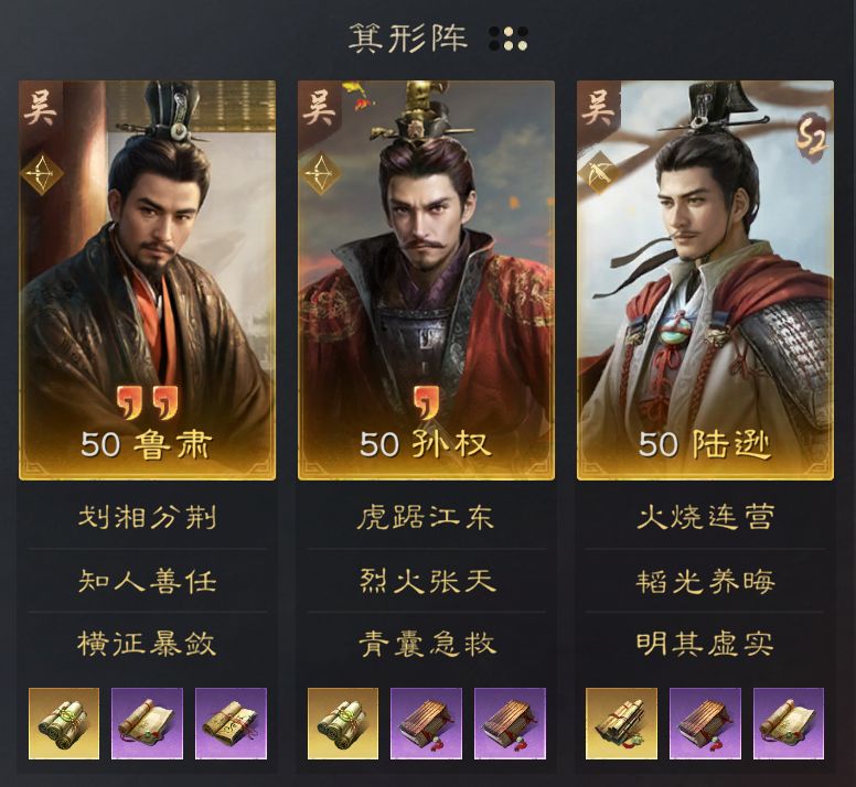 孙权能够为鲁肃和陆逊提供主动战法发动率加成,鲁肃能够同时为队友提供减伤,并增加敌军所受伤害。队伍多种减伤手段可以让陆逊足够存活至后面的回合,将【火烧连营】的伤害发挥到最高。