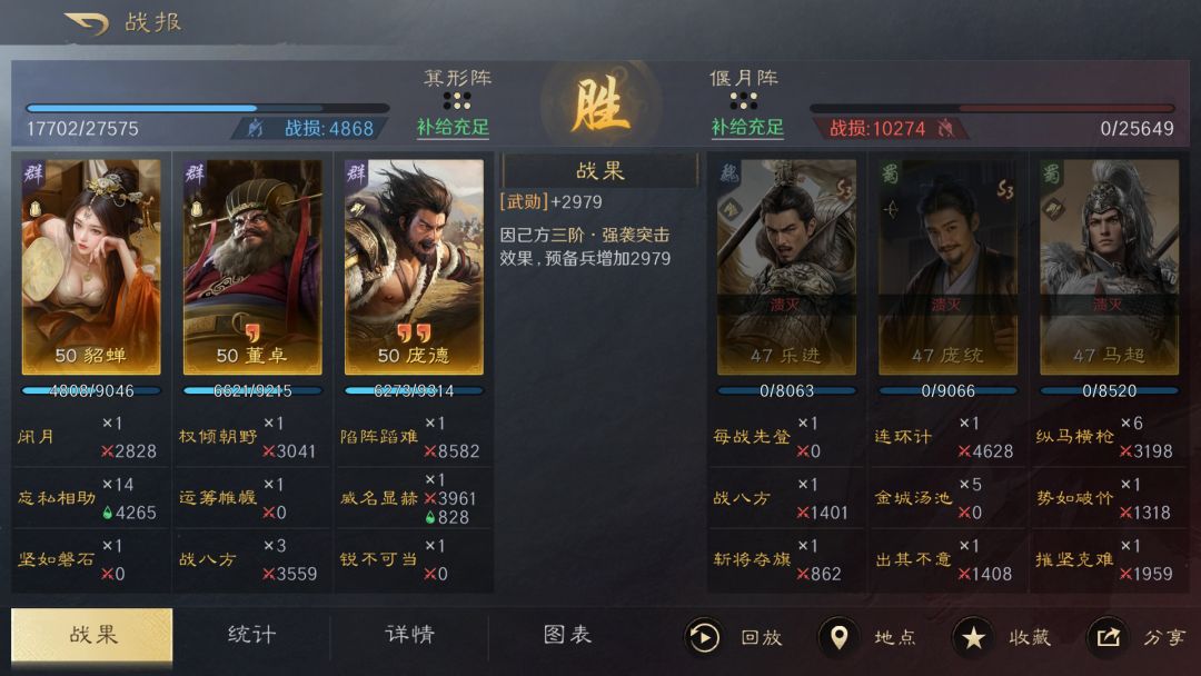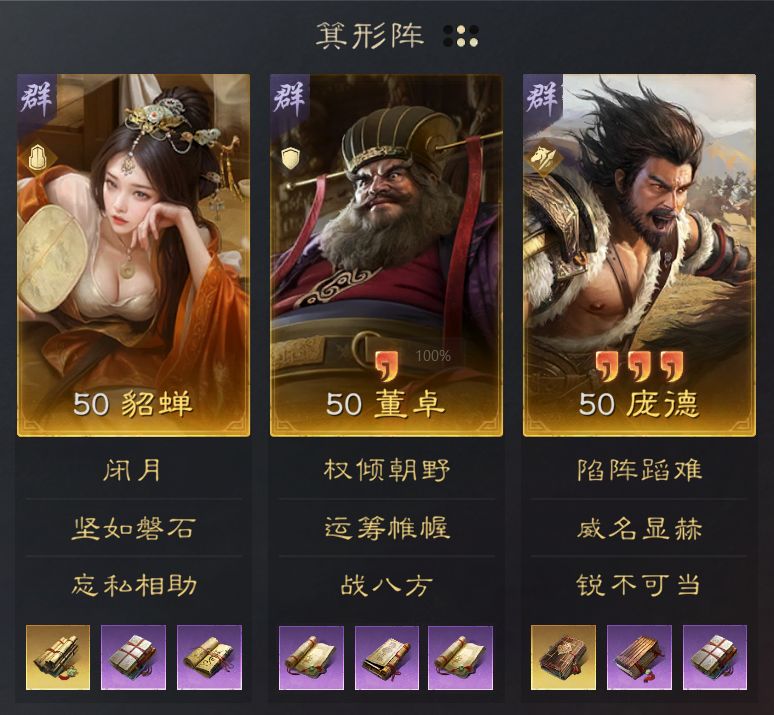董卓的【运筹帷幄】和庞德都能够降低敌军的智力和统率,十分克制依赖智力输出并且统率值较低的谋略队伍,只要让庞德发动【陷阵蹈难】,就能极大削减敌军兵力。貂蝉自带减伤,而【忘私相助】能够有效克制庞统的【连环计】和【万夫莫当】这类带传递伤害的战法,对上目前热门的庞统体系队伍,也有极好的克制表现。