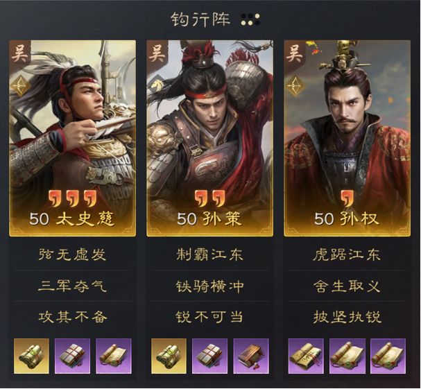 孙策的藏品韬略可以让孙策的【制霸江东】变为追击战法,让其能够一回合多次发动,输出上限更高。而太史慈也能够稳定连击,利用【三军夺气】和控制类追击战法对敌军施加负面效果。孙权和钩型阵,能让队伍的连击率得到进一步提升,孙权还能提供谋略减伤。