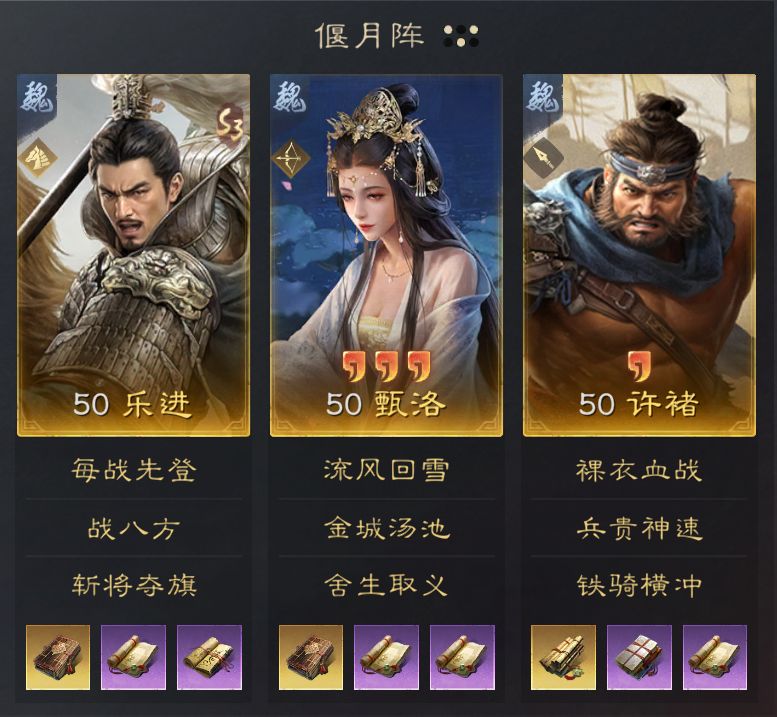 乐进的增伤和甄洛的增伤可以让许褚的输出提升到极致,同时乐进还能为许褚提供减伤,甄洛利用专属韬略也可以指定为许褚提供治疗,弥补了许褚统率值较低的短板。许褚的高爆发,能够有机会快速削减敌军单名武将的兵力,让对方快速减员。