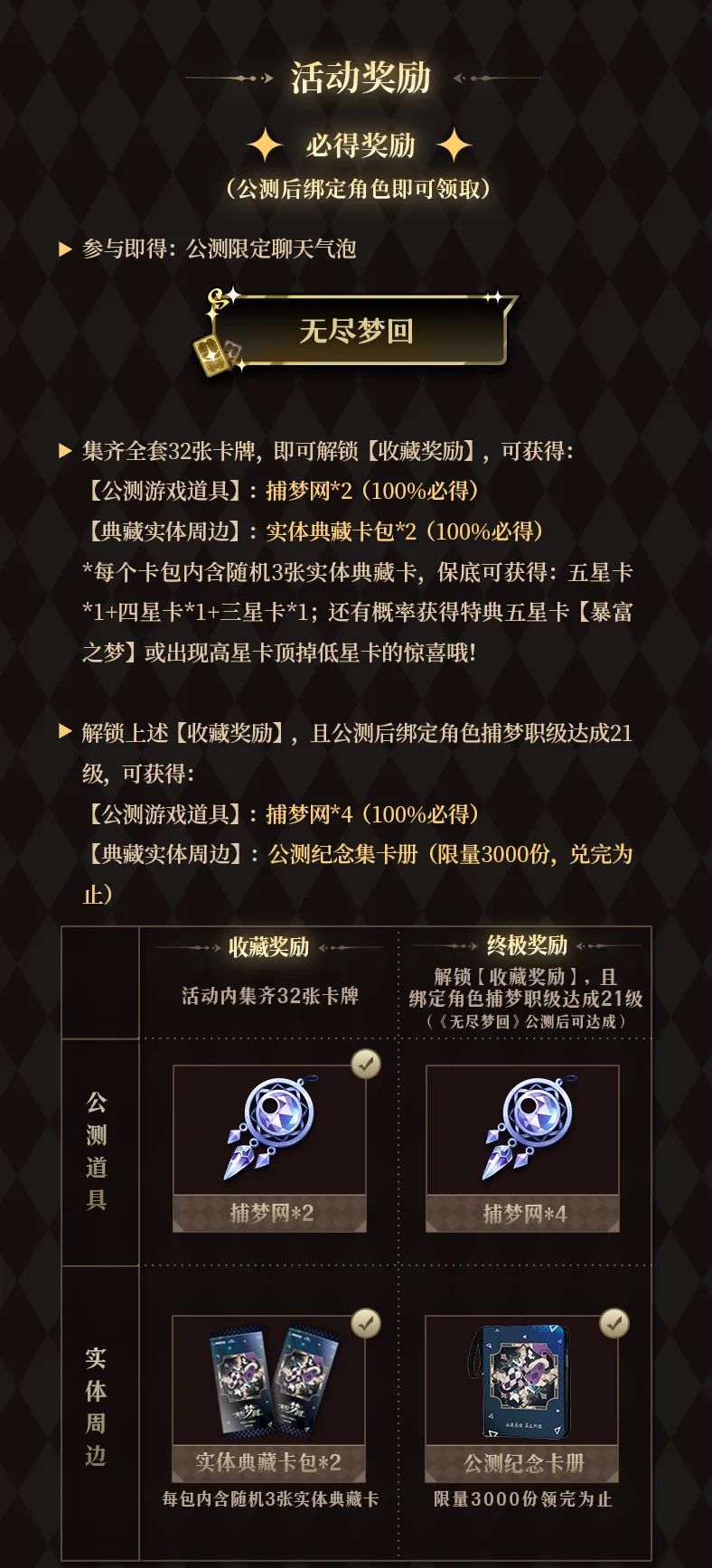 集卡活动规则调整:终极奖励解锁条件调整至30级,限量3000份公测纪念集卡册增加到5000套(温馨提示:公测纪念集卡册为卡牌收集册,不含卡牌)