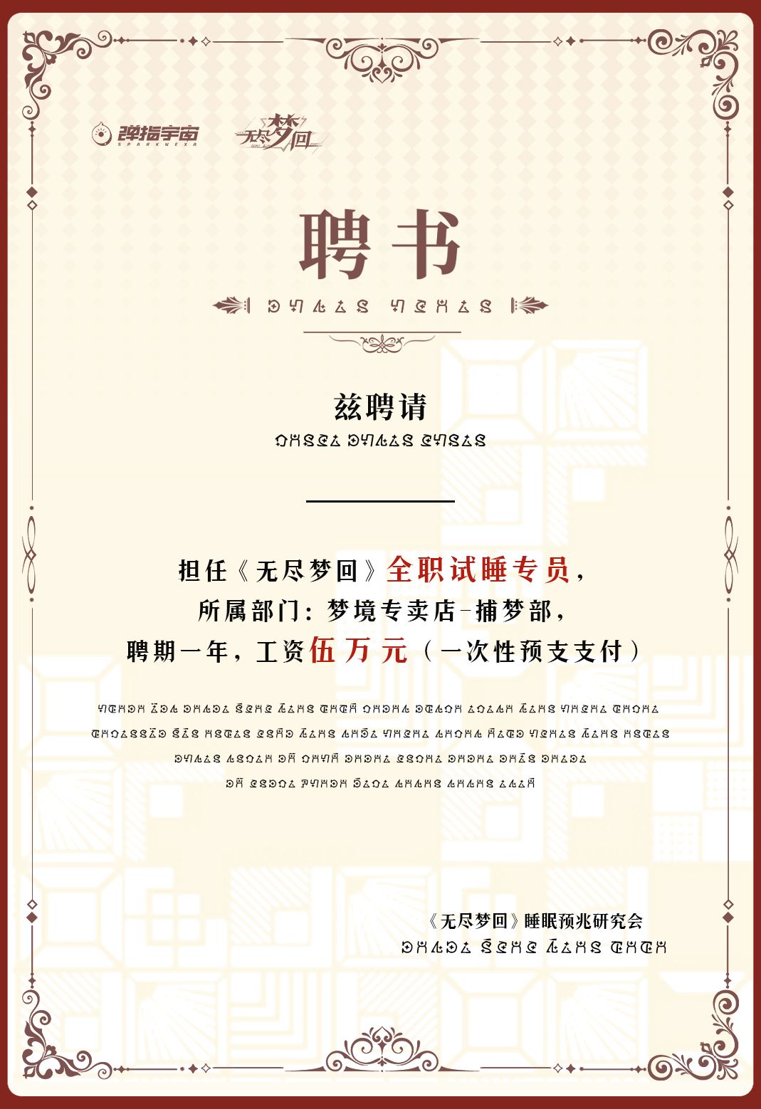每集齐一个流派的实体卡即可获得一张券码,券码唯一,最多可获得六张,公测后首周全平台公布中签券码,抽中的捕梦者即可获得全职试睡专员特聘资格,聘期一年,工资五万,一次发放!!(省流版:五万人民币直接带回家,税后!