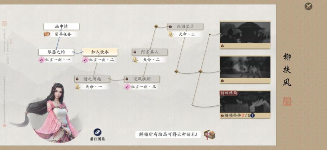 当然了,你可以对柳扶风的命运进行更改,从而获得特殊结局,特殊结局的开启方式如图所示,至于特殊结局什么样,就需要少侠亲身体验了哦。