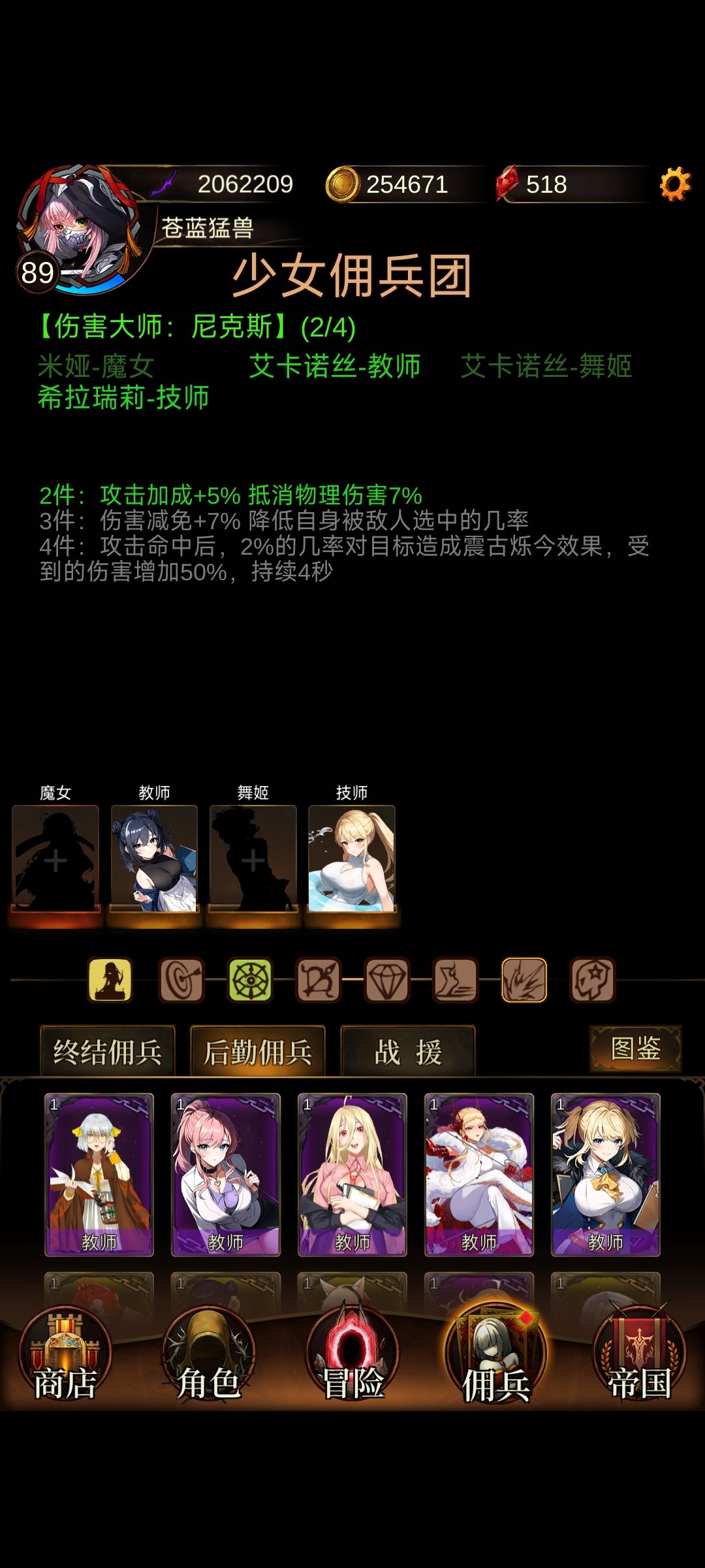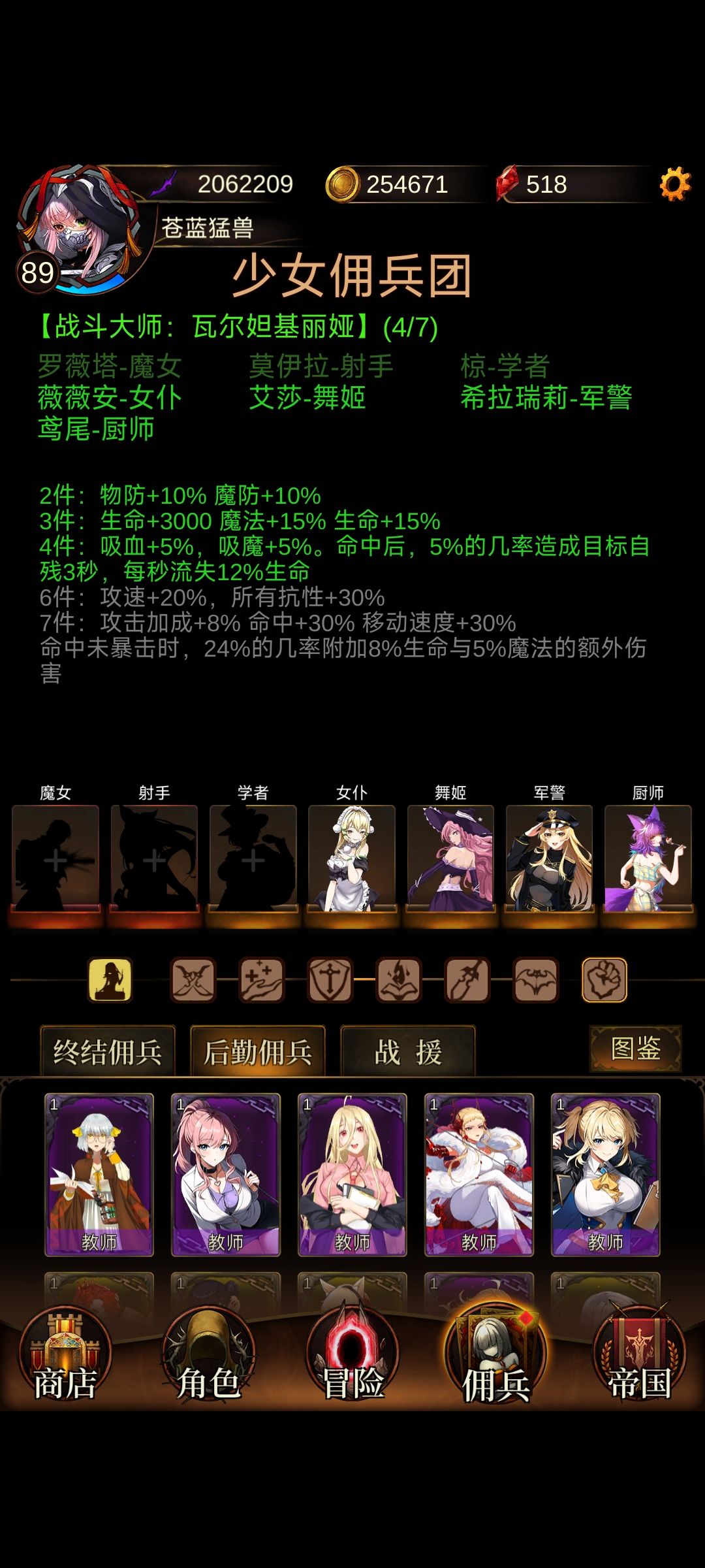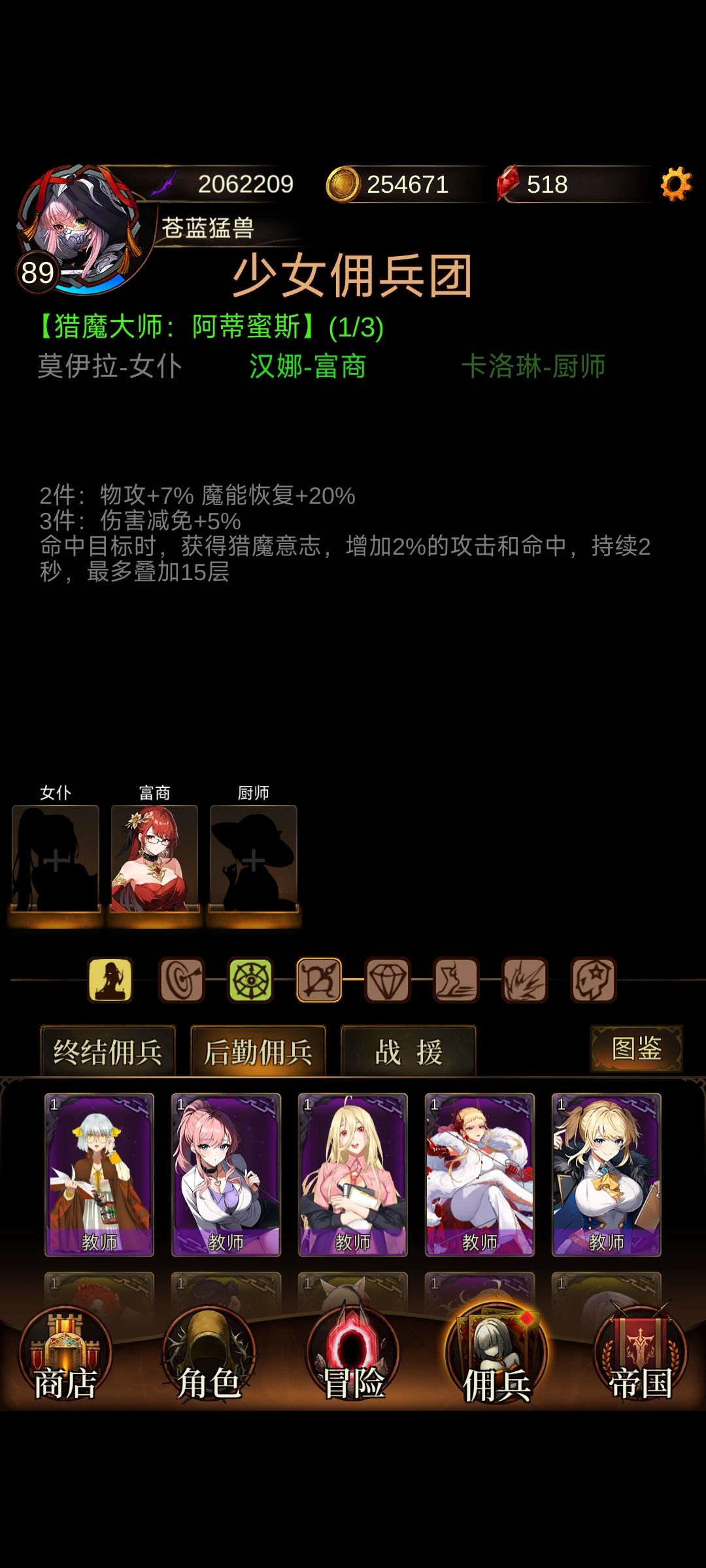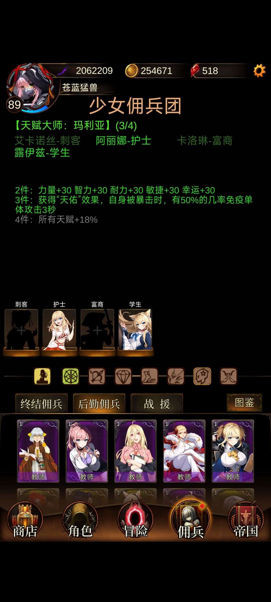 少女佣兵团的选择,不用过多纠结,除了天赋大师,伤害大师,猎魔大师,战斗大师,这几个比较有用,其他收益极低不提,我们更应该跳出佣兵团这个圈子,更多的考虑佣兵自带的——金色传说属性!
