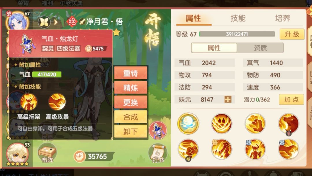 5、高级连击强化可以让输出最大化,高级招架和高级攻暴强化效果不大,所以选择在护符上,因为没打重生和执念(这两个技能被万灵克死了),我选择加血的护符,可以保证净月君前期不死