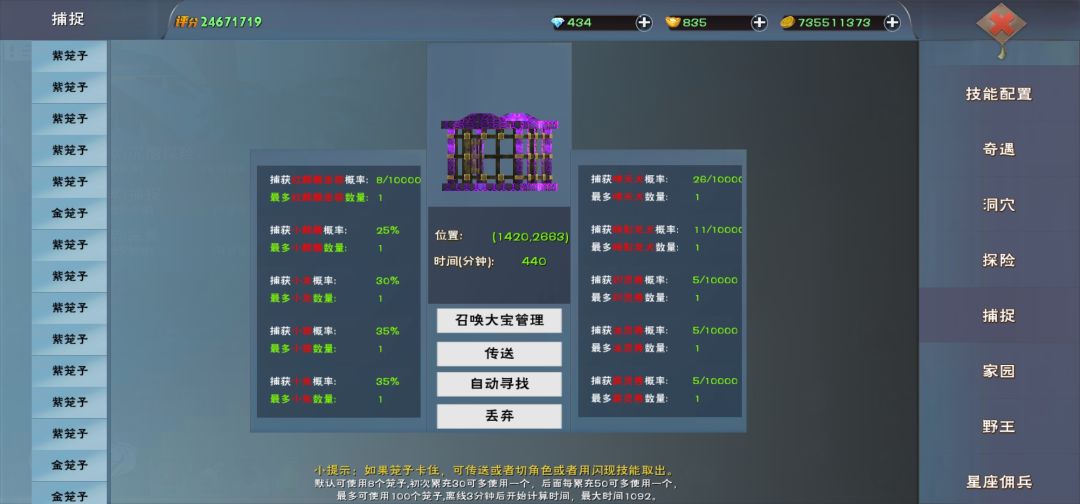 3、金币自由大法:家园解锁后,装备强化、打造、商人、技能师都直接回家园(小地图下方——房子图标——家园——左上角回家1000金币)搞,点开小地图,去家园上方的雪山(白色区域),点背包——物品——紫/金笼子,选一键放置,没有充值的话只能放8个(每充值50元多放1个,挂机时间多50分钟,原始挂机时间4小时)。一键放置完后点小地图下方小房子图标——捕捉——召唤大宝管理——和大宝对话——输入5点击一键捕捉,过个把小时召唤出大宝点收获(可以用回档大法抓4狗),背包——宠物——全部卖掉!