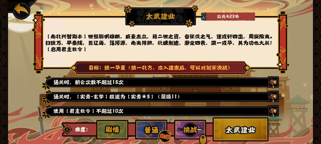 这个剧本有点难主要难在这个玄学政道太折磨人了。官方这北凉沮渠牧健直接不做可还行。后凉当时已经没了,还后凉也太敷衍了。立绘重复慕容超用隗嚣的。北燕和大夏也没立绘,都是重复。末代匈奴王不配拥有单独立绘。就怕第三批……