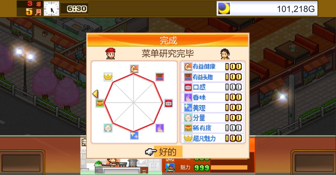 哈哈,终于达成完美开局,一周目3年5月怀石达到八维全100,当月营业额高达9万8。