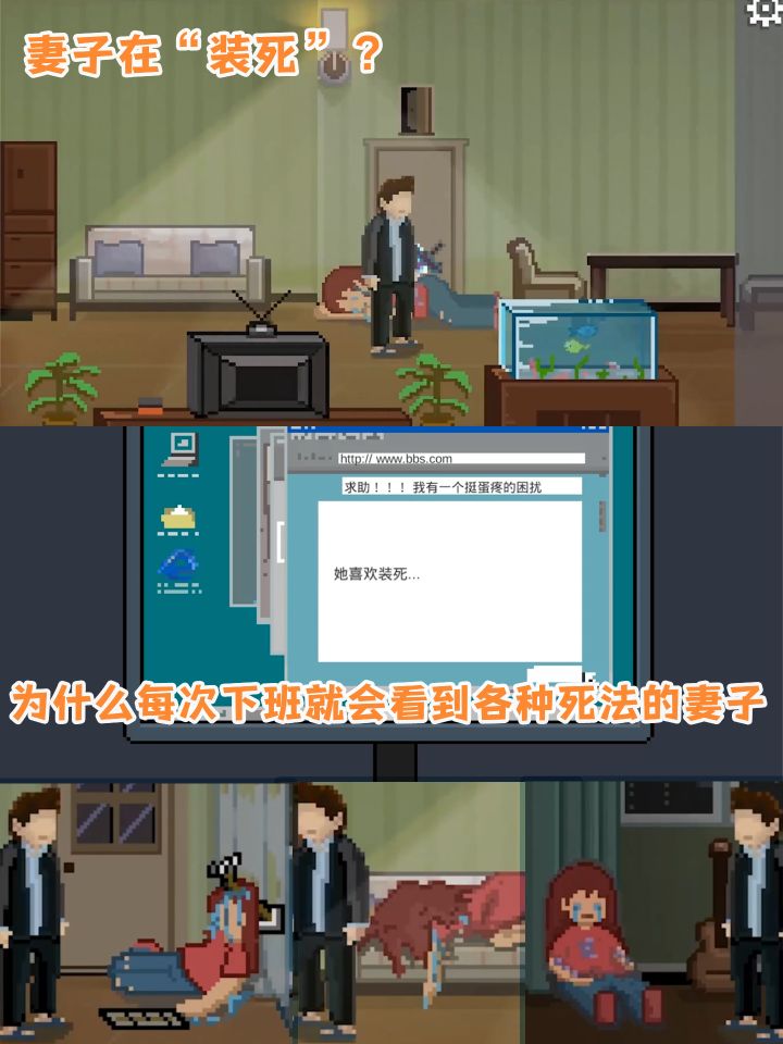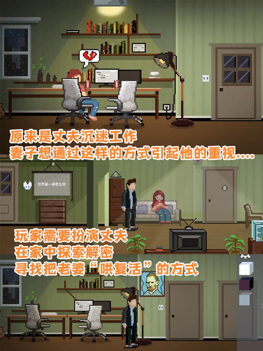 她的这个行为有些猎奇了吧~原来是为了让醉心工作的丈夫再多重视一下自己,玩家需要扮演丈夫通过解密,在家中收集道具,想方设法把老婆“哄复活”
