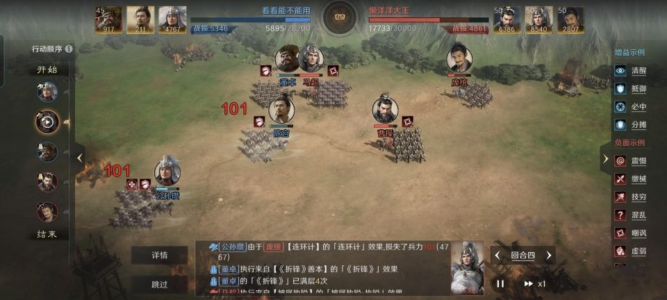 曹操战法:乱世奸雄+任人择势+忘私相助。韬略库:大破善本+练士善本+孟德新书上卷(专属)。重盾兵特性不屈,专精点亮屹然不动。身处箕形阵前排的曹操,自然是在掩护方面能做得比较扎实的。在任人择势的作用下,后排的马超和庞统将分别获得会心和奇谋,曹操只要做好挨打和喂奶的工作,剩下的交给马桶双侠便是。