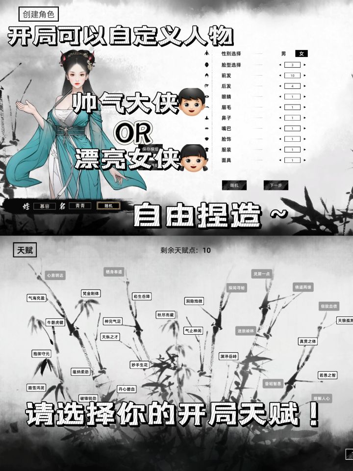 1️⃣既是沙盒游戏,又是开放世界,这两个关键词都指向了一个特点“自由度超高”,《刀剑江湖路》开局时便可以自定义自己的天赋资质、样貌性别等,从无名之辈伊始,投入这个动态且随机的江湖。
