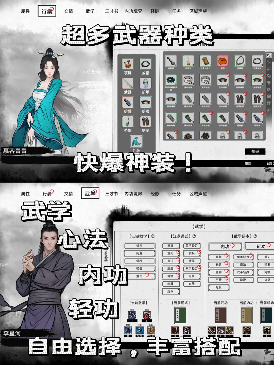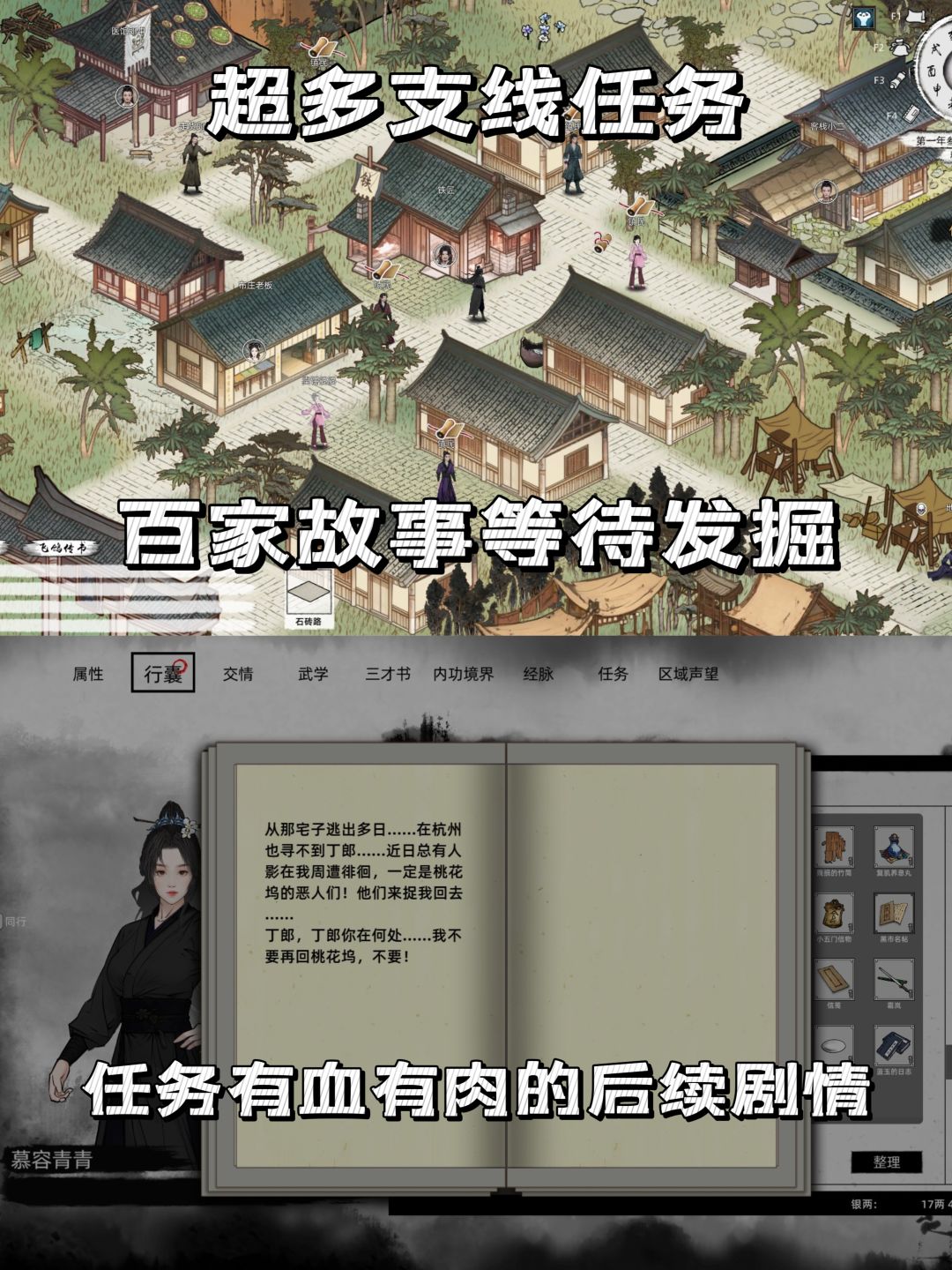 🧙🏻♂️它主打一个“畅游武林,随心所欲”,既可以脱离主线自由探索养成,也拥有着十分充实的剧情文本和大大小小无数个百姓故事,随机NPC与事件构筑成了一个完全开放的江湖。