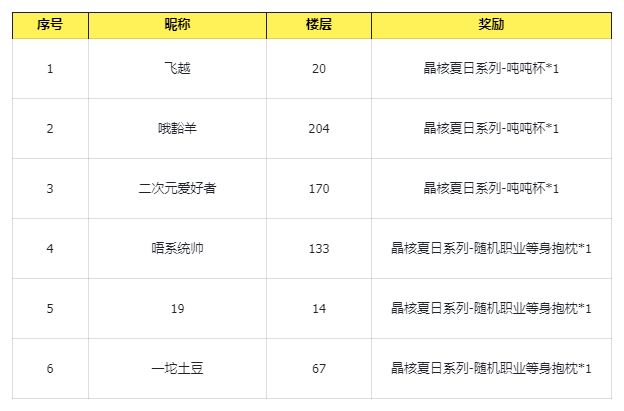 回复层数达到50层时,随机抽出3位冒险者,每人送出晶核夏日系列-吨吨杯*1