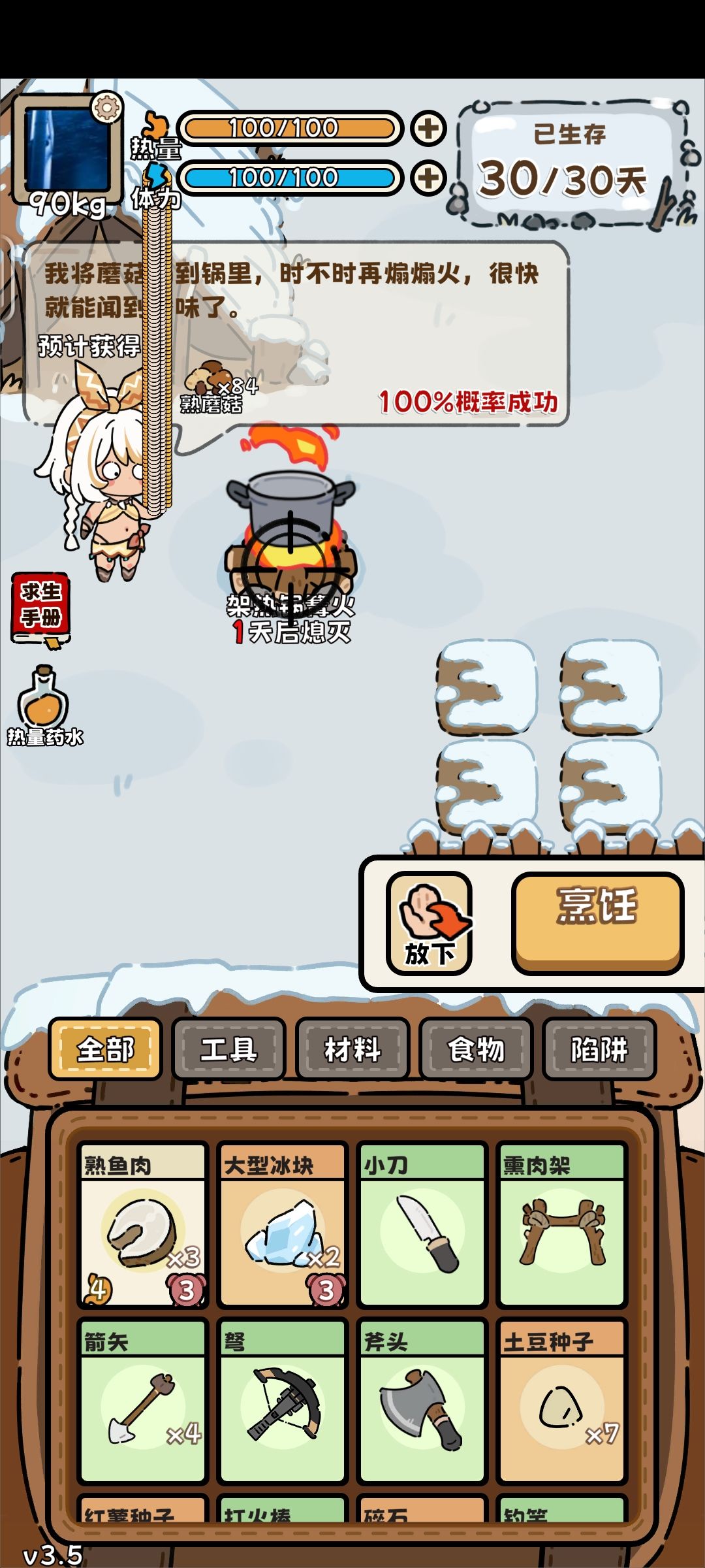 后15天攻略:越冬才是这个游戏真正的难点和考验,入冬之后要小心控制自己的热量和体重,优先把临期食物吃掉,并且根据食物储备合理安排得到的食物到底是煮还是熏,偶尔爱斯基摩人会来找你要工具,有就给他就行,反正放在自己手里也没用了,木材足够的话就可以融化冰块,但注意融化冰块会掉一天的燃烧时间,别把篝火弄灭了。如果有幸运药水的话,记得攒三天的冰一起喝了幸运药水再开。等到热量空了的时候还可以看一次广告恢复满热量,这个也够撑两天的,如果20天之后运气好能出个熊或者海豹,那这把基本就稳了,但更多的时候运气没有那么好,关键的操作就来了,这个操作决定了你能不能通关,这个关键就是种蘑菇,前面不是让你有体力就去砍木头吗,这个时候就要用上了。由于种蘑菇非常重要,接下来单独讲。