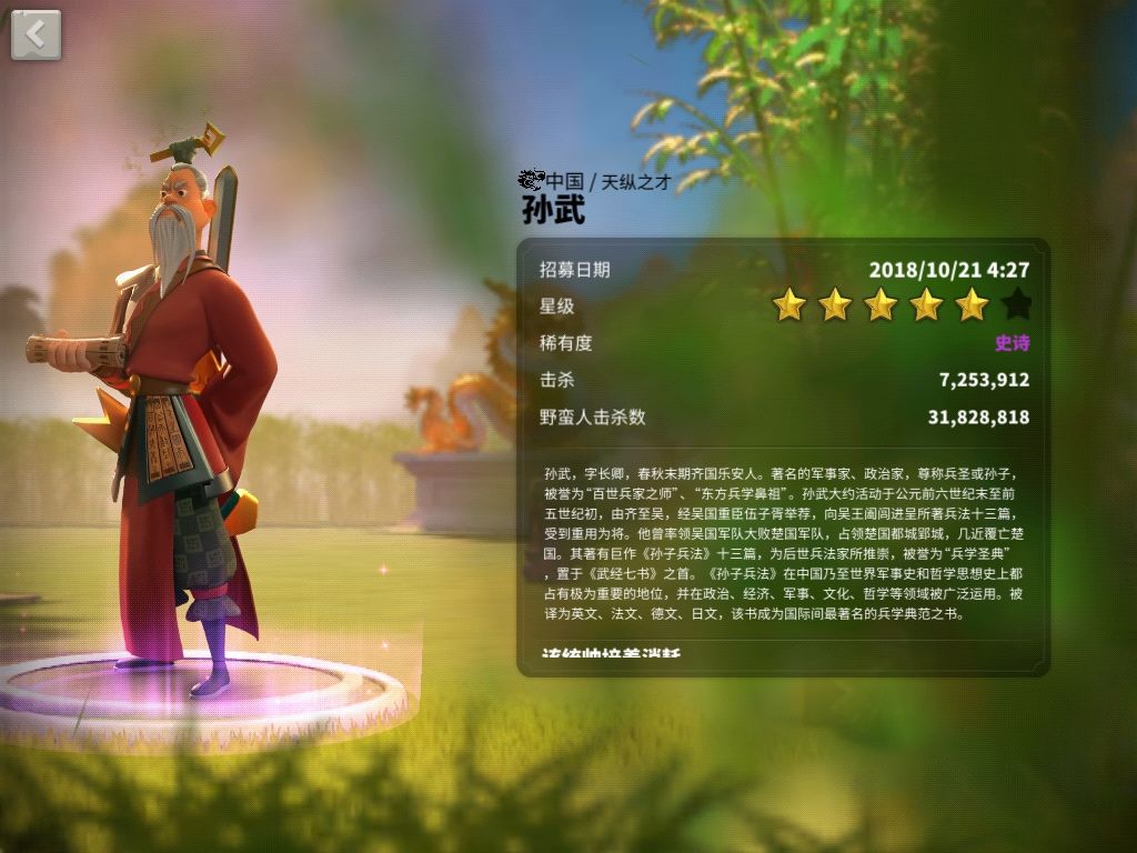 孙武,春秋末期齐国乐安人,百世兵家之师,东方兵学鼻祖,曾率领吴国军队大败楚国军队占领楚国都城;著〈孙子兵法〉十三篇为后世兵家所推崇,誉为兵学圣典置于〈武经七书〉之首!万国觉醒当中,兵圣孙武是可选初始统帅,也是步兵体系核心,对于步兵其影响之深,几乎奠基步兵,成就霸主之位!