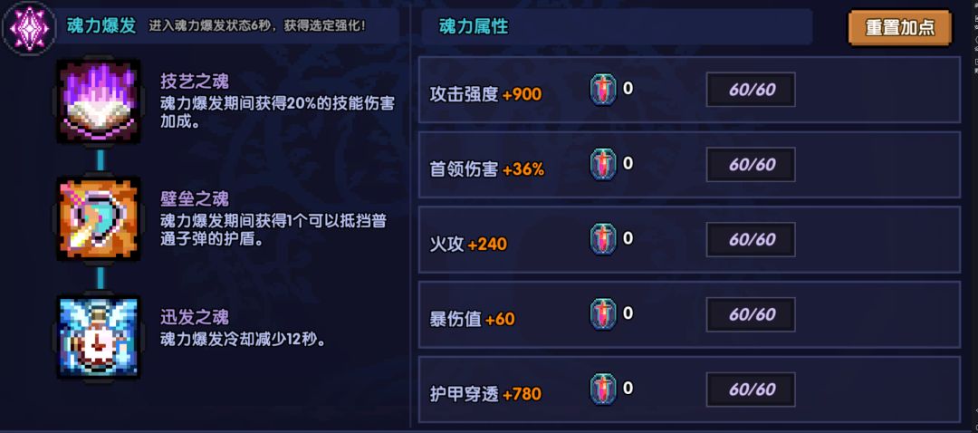 攻强--最后多出的点数两者攻强平均分配对于魂点不够用的同学,在满足穿透和暴击的前提下,各项属性平均分配点取,或者可根据自己面板来自己调整加点