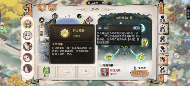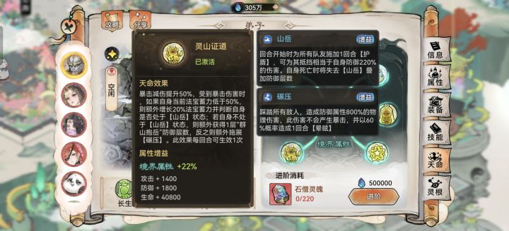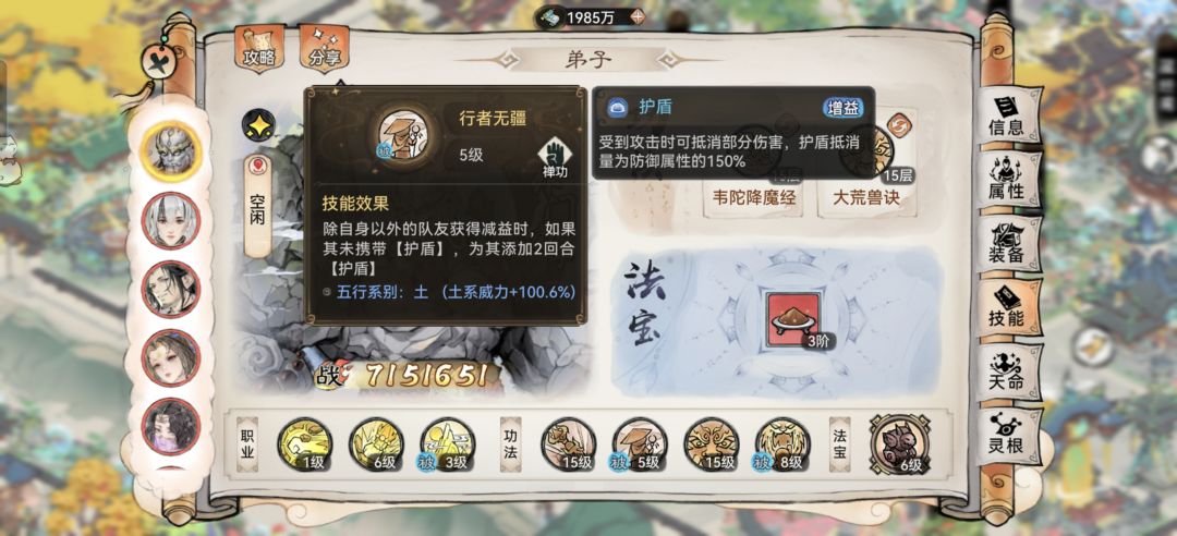 3.主坦位&辅助位出装:这里笔者在金刚跟列阵中犯了难。因为携带功法还有山岳机制自带护盾且与防御挂钩,笔者更偏向于选择金刚,增加前三回合抗伤。词条以防御生命为主,物/法减和效果抵抗/命中持平,都可以选择以增加咱石头人的硬度。法宝优选三阶土鳞炼化生命,本命推荐遮天、镇岳、伏龙甚至济世葫芦等其他属性相对契合的胚子。道兵主推月满今宵,其他功能性道兵也可以。功法必带大荒兽诀,备选玄岩、禅那经、地藏等辅助类功法。灵根点满伤害减免即可。