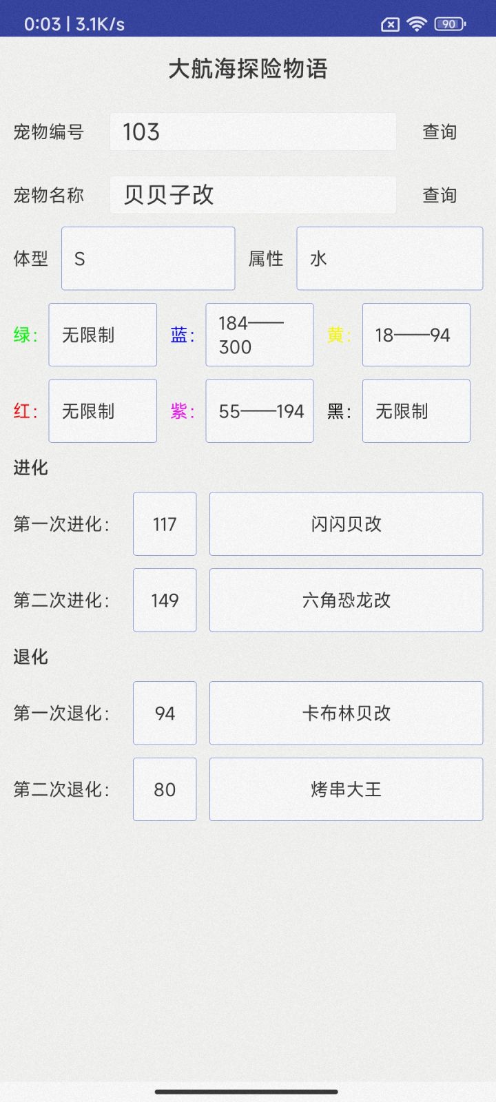 贝贝子改升到50级最终变成六角恐龙改就可以觉醒了变成六角恐龙真,觉醒材料全随机这就得你自己查色素表了