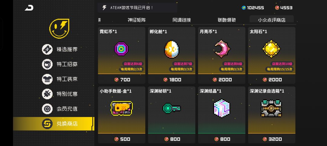 小众点评商店、推荐蛋、蛋孵化材料、小助手升级材料、霓虹和月亮币、太阳石。