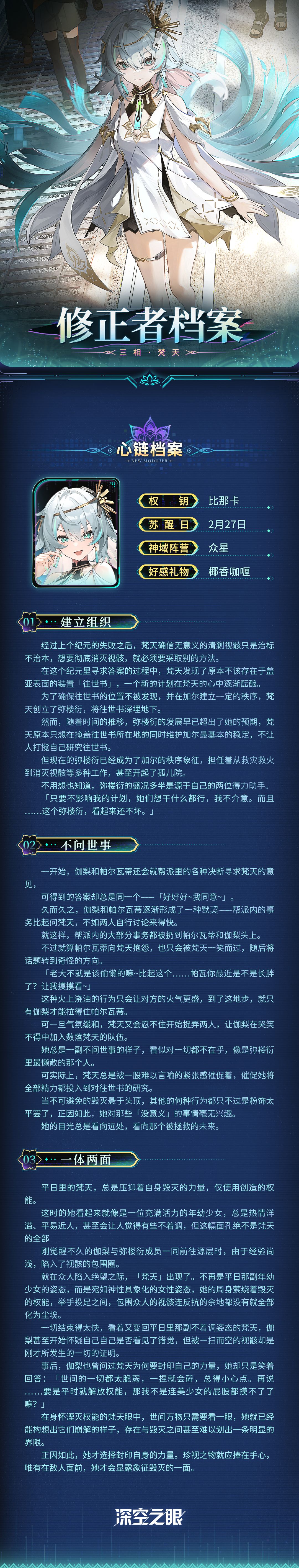 身为弥楼衍的创立者,平日里的梵天总是一副不问世事的样子,像是组织里最懒散的那个人,可实际上,梵天将全部精力都投入到对往世书的研究,只为能早日找到彻底清除视骸的方法。