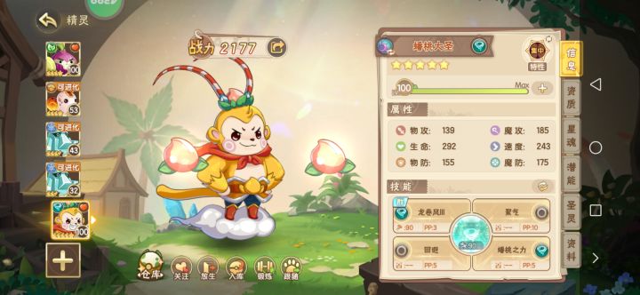 第三阶段:上集中大圣,先点回避,再点蟠桃之力,进化直接大招+龙卷风(魔攻高的用扩散气流)