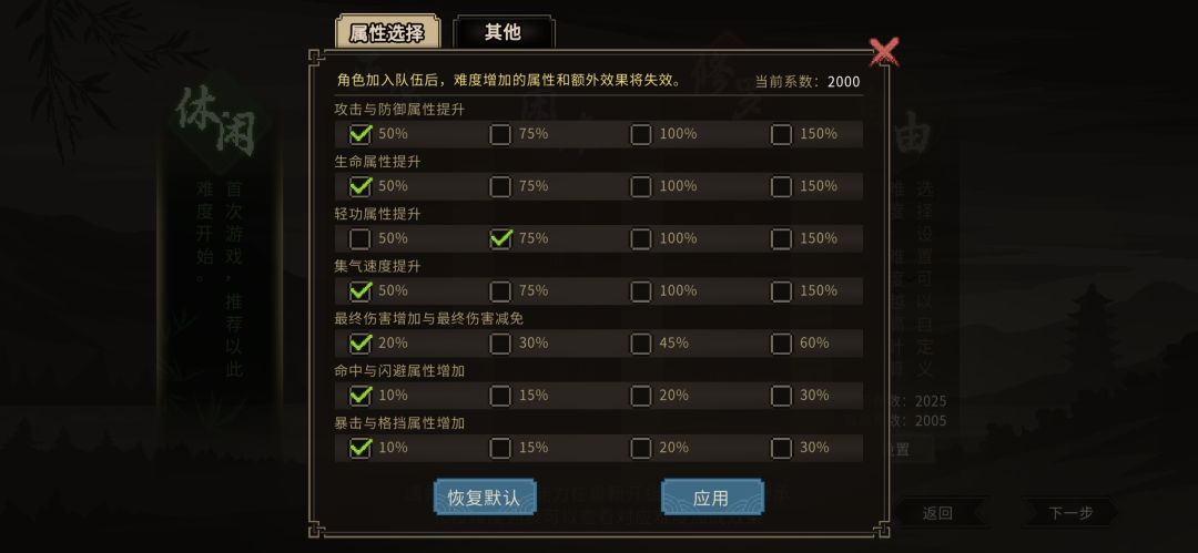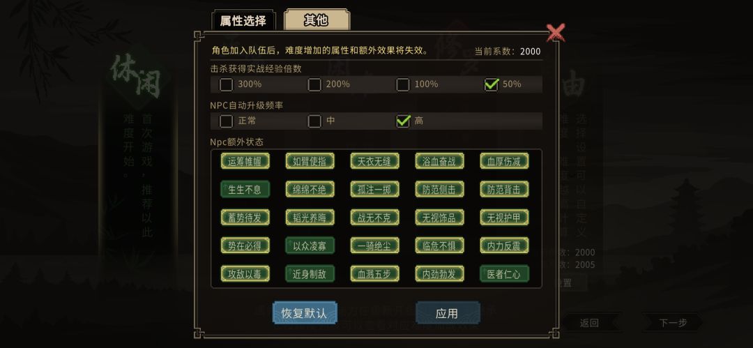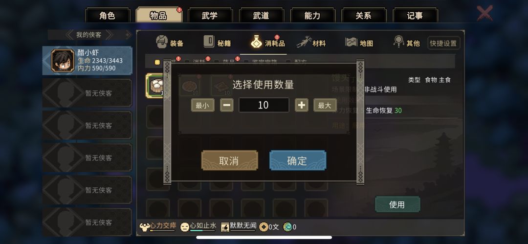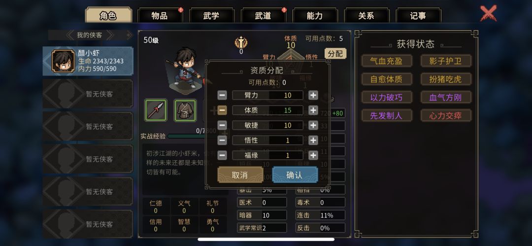 配置完武道记得先把点数分配了,臂力、敏捷不满10的就点满,剩下的全加体质,加完之后血量会空一截,开局选的食物记得吃了回满血再存档,随时存档养成良好习惯,如果有领心动领域的也可以戴上,增加200血量跟20免伤