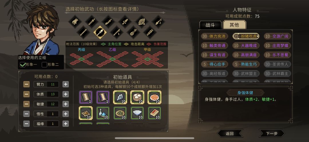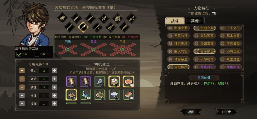 武器的话选枪法,物品把三个能回血的都带上就够用了,属性点的话主要是体质必须加满,其次臂力、敏捷,如果开局都能点满10点就最好了,不行的话,进去再点也好,少一两点体质区别不大