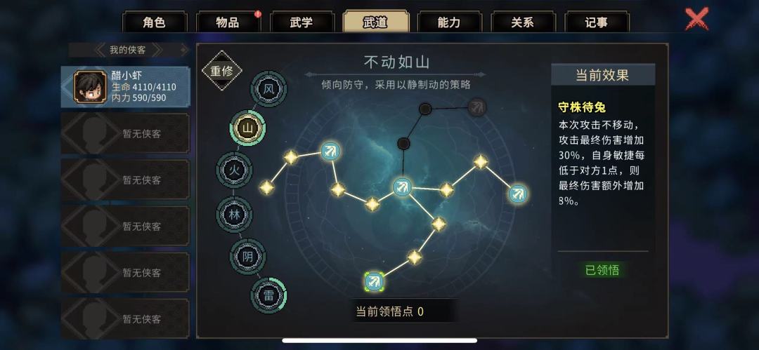 不动如山提供防御能站的更久,守株待兔不移动还能加30%伤害,