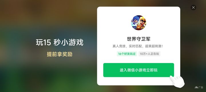 如图,点击看广告就是这个界面,让你去微信小程序玩15秒,背后没有任何广告,等两三分钟还是在这个界面。就算你点了去玩小程序游戏,但你玩多久他都没有任何动静!我请问你游广告是怎么回事?