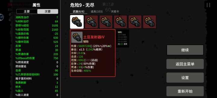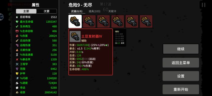 收获卡提供的收获加成是指数级别的,我自己的号刷了两个小时的天赋卡,拿下了4个6级,4个五级的收获卡,进游戏面板收获105,每波加成117%,拿下王冠后每波加成125%,到了第15波时收获为2千万 ,生命为140万,土豆发射器暴击率1000%,单发伤害8千余万,简直恐怖如斯。