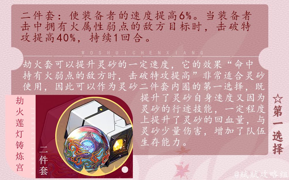 劫火套可以提升灵砂的一定速度,它的效果“命中持有火弱点的敌方时,击破特攻提高”非常适合灵砂使用,因此可以作为灵砂二件套内圈的第一选择,既提升了灵砂自身速度又因为灵砂的行迹技能,一定程度上提升了灵砂的回血量,与灵砂少量伤害,增加了队伍生存能力。