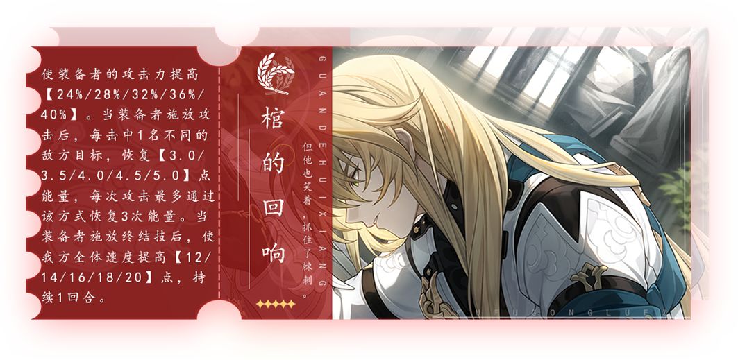 该光锥拥有高额攻击力加成,效果会恢复能量,因为灵砂战技与终结技均为群体攻击,可以很好的满足回能量的效果;在装备者释放终结技后,我方全体获得速度加成。与唯有香如故对比,该光锥多了攻击、全队速度加成与灵砂自身回能,少了易伤与击破,优化了灵砂的充能,又加强了灵砂的保人能力,因此可以作为灵砂五星光锥的另一选择。
