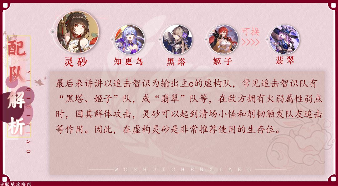 最后来讲讲以追击智识为输出主c的虚构队,常见追击智识队有“黑塔、姬子”队,或“翡翠”队等,在敌方拥有火弱属性弱点时,因其群体攻击,灵砂可以起到清场小怪和削韧触发队友追击等作用。因此,在虚构灵砂是非常推荐使用的生存位。