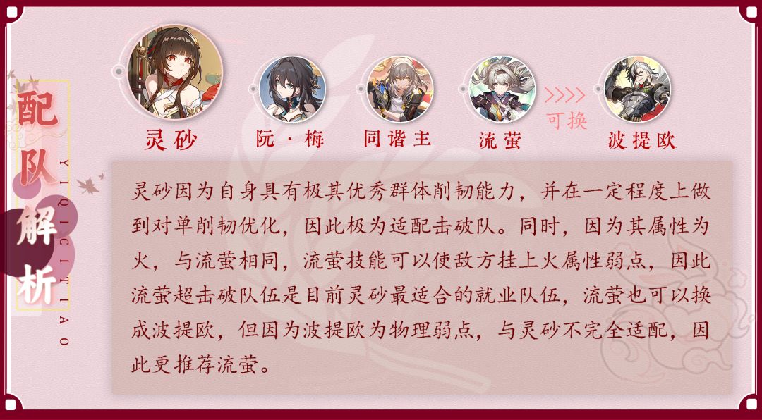 灵砂因为自身具有极其优秀群体削韧能力,并在一定程度上做到对单削韧优化,因此极为适配击破队。同时,因为其属性为火,与流萤相同,流萤技能可以使敌方挂上火属性弱点,因此流萤超击破队伍是目前灵砂最适合的就业队伍,流萤也可以换成波提欧,但因为波提欧为物理弱点,与灵砂不完全适配,因此更推荐流萤。