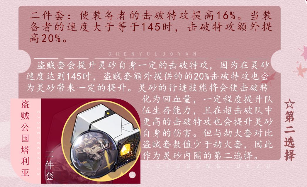 盗贼套会提升灵砂自身一定的击破特攻,因为在灵砂速度达到145时,盗贼套额外提供的的20%击破特攻也会为灵砂带来一定的提升。灵砂的行迹技能将会使击破转化为回血量,一定程度提升队伍生存能力,且在超击破队中更高的击破特攻也会提升灵砂自身的伤害。但与劫火套对比盗贼套数值少于劫火套,因此作为灵砂内圈的第二选择。