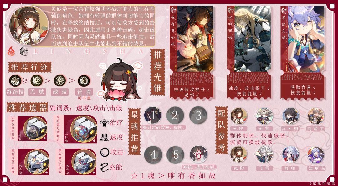 需要注意,灵砂单次冶疗量较低,因此,需要高速多次来弥补单次冶疗量较低的情况。但如果灵砂就业于队伍击破队、飞霄追击队时,因其击破能力较强,对应的生存能力也较强,所以在击破队,追击队中可不用太关注生存。