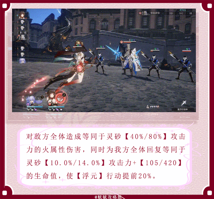 灵砂释放战技可立即对敌方全体造成一次伤害与群体削韧,对我方目标进行一定的回血,此时如若场上未存在【浮元】则增加一次【浮元】的行动次数,同时【浮元】行动提前。在战技点充足,队友血量较低或灵砂不会抢击破主C弱点击破的情况下,可以考虑释放战技进行回复队友生命,调轴与增加【浮元】次数。