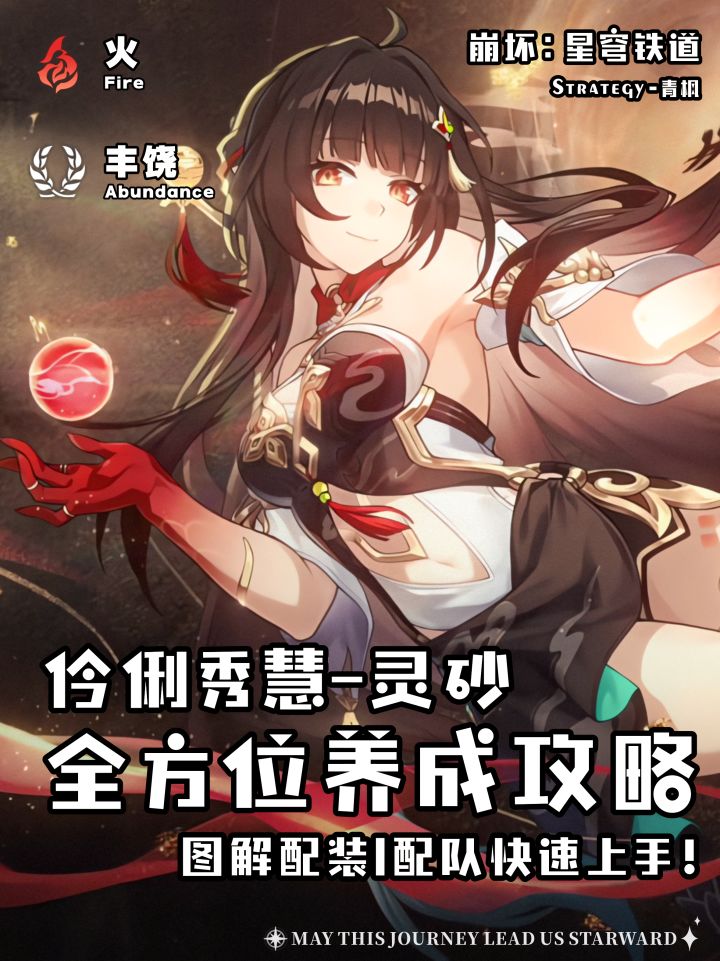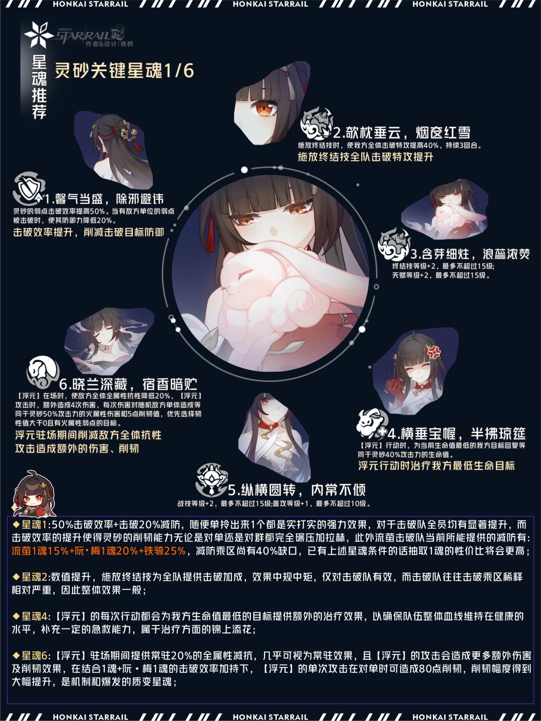 灵砂是一名火属性-丰饶命途角色,通过终结技能够提供更高数值的击破易伤,进一步提升击破队的伤害体验,是当前击破队的最佳生存位,施放战技可召唤烟兽【浮元】加入行动序列,行动时发动追加攻击造成群伤,同时协助削韧从而加快击破效率,这也使其能够灵活适配于追击队,拥有出伤能力的同时也是一位合格的限五生存位,击破队中表现最优但也仍具备泛用性;